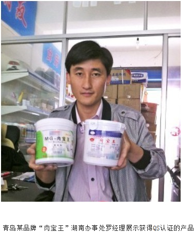 記者隨意走進10棟的一家食用化工商行。該商行的進門處,放著多箱標注產地為青島的“肉寶王”。記者從貨架上拿起一桶正要查看,老板蔡先生循聲從里面走出來,警惕地問:“你是做什么的?”記者表明了身份,表示希望坦誠交流,蔡先生這才放松緊張情緒。“你不曉得,這兩天來我店子里暗訪的記者不止一位,所以我一看你走進來,就猜你可能也是記者。”蔡先生說。