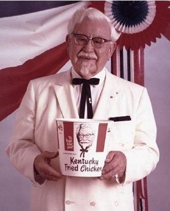 創(chuàng)始人桑德斯上校創(chuàng)辦肯德基時66歲,靠每月的$105社保生活。在肯德基獲得成功而接受電視臺采訪時,他找出自己唯一一套干凈的、白色棕櫚裝,從此這一打扮成為他獨特的標識造型,并以此注冊商標。從此以后,人們便將這套西裝與肯德基聯(lián)想在一起;而他的這身白西裝,滿頭白發(fā),及山羊胡子也成為了全國性的象征。因為生意做的好,肯德基州長于1935年封他為肯德基上校,以表彰他對肯德基州餐飲的貢獻。