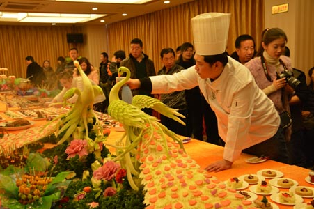 這121道菜品是充分利用一整頭人工飼養(yǎng)的野豬烹制而成,其體重在300斤以上,從頭到尾,加上皮、骨頭、豬腳、內(nèi)臟等都被名廚們烹制成了美味。由于菜式較多,烹制工藝復雜,所以前期籌備用了4天的時間,正式上灶烹制是在30日21時許,并于31日10時30分全部制作完畢。這么做的目的就是要保證各道菜品的食材優(yōu)良,菜色優(yōu)美,由此給觀賞者帶來視覺和味覺上的雙重享受。