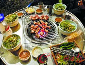 “為了吃上一頓韓國烤肉,大家拼命往前騎,這成了每天騎行的目標(biāo)。”車友龍輝開玩笑說。這位美食家絕對是“吃貨”中的高手,每次騎行隊抵達(dá)一站,不管早晚他都為大家覓食。抵達(dá)浦項后,龍輝很快找到了一家烤肉店,從超市高昂的肉價推斷,烤肉肯定是奢侈品。不過,車友們已顧不上價錢,一盤肉不夠,就再上一盤。雖然韓國泡菜免費、美味,但每餐的費用不低,7000韓元一餐(約合人民幣42元)基本上沒有肉,有肉的至少要1萬韓元。