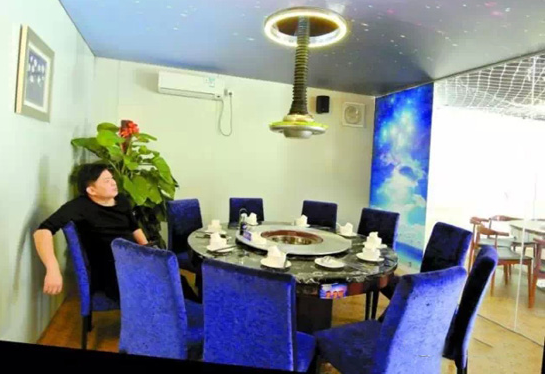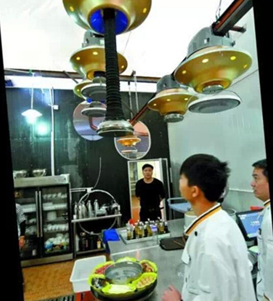 進(jìn)入餐廳,首先映入眼簾的是頭頂上灰藍(lán)的太空和耀眼的星星天幕,最奇特的是有幾只金色的飛碟吊著托盤,托盤上盛滿菜,沿著軌道在“太空”中運(yùn)轉(zhuǎn)。當(dāng)運(yùn)轉(zhuǎn)至餐桌上方,飛碟會自己停住,伸下長長的“腰”,將菜送至客人面前。