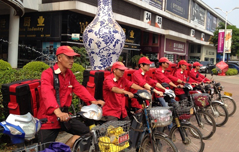 現在我有13個專職送餐員,4個兼職送餐員,還有外包物流公司的配送人員,一共20來個人,其中有總負責人。距離遠的地方,我就放兩個人在那邊待著,餐廳的人像接力棒似的,25分鐘會過去一趟。高峰期就馬上放一個人過去,一趟送完再回來接力。中午最多是2個高峰期,11點半和12點。我也會按區域劃片,高峰期不同的區域會有不同的人負責。我對送餐員也會有培訓,高峰期不同的線路會互相支援。