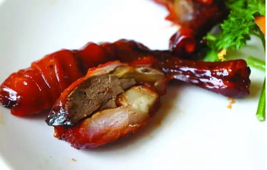 在清末民初的廣州,已經有出現的“鴨腳包”,又稱“鴨扎”,它比“桂花扎”還要早流傳在廣式燒臘檔中。在那時候,無論是大小酒樓還是街邊燒臘鋪,都會見到鴨腳包的身影,但具體是誰首創的,就不得而知了。“鴨腳包”顧名思義,就是用鴨腳包食材再用鴨腸捆扎,放入爐中烤制。而鴨腳包著的食材,既有鴨肝或者雞肝,也有肥叉燒或者冰肉。