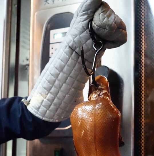 烤鴨一出爐,就會被立刻分割,如果沒有馬上做成漢堡送到運氣超好的客人的嘴里,就會把分好的鴨皮和鴨肉分開專門保溫。對烤鴨了解至極的大董專門為鴨皮和鴨肉分別設(shè)計了不同的保溫箱,溫度和濕度都不一樣,以保持剛出爐的風(fēng)味。鴨子最多在里面呆四十分鐘,這是大董認為可以保持鴨皮噴香酥化、鴨肉多汁鮮嫩的完美狀態(tài)的時間范圍。在這個時間內(nèi)沒有用完的鴨子,就不要了。