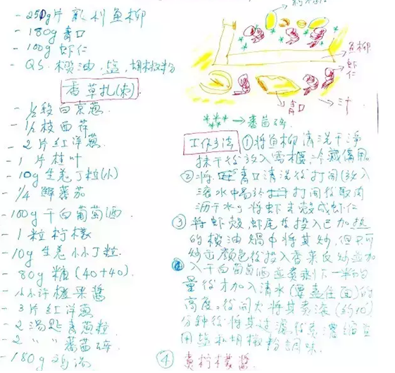 阿KEN的手繪菜譜很有藝術(shù)感,除了常規(guī)的做法之外,還有菜品擺設的外觀圖。徒弟們看過之后,就能做出同樣效果的菜品來。