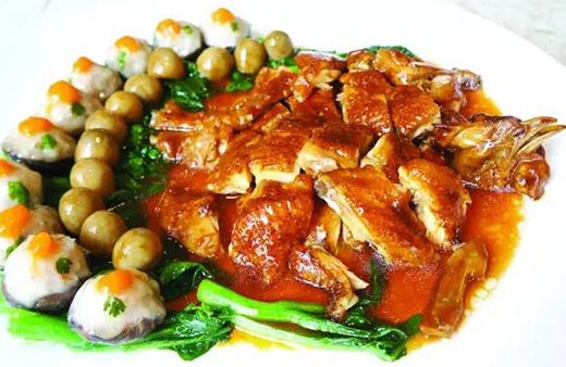 制作茅臺(tái)雞,還必須有百花釀花菇、草菇和菜心軟伴碟。百花釀花菇是用新鮮的蝦肉打成蝦膠,每粒5錢重釀入1元硬幣大小已經(jīng)入好味的花菇內(nèi),需釀制10粒,最后在百花餡上點(diǎn)上新鮮的蟹膏。