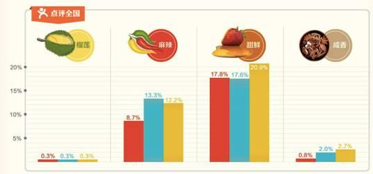 《中國(guó)餐飲報(bào)告(白皮書(shū)2017)》的最新數(shù)據(jù)顯示:2016年,甜鮮口感的受歡迎程度已經(jīng)小勝麻辣這一記憶度最高的口感。