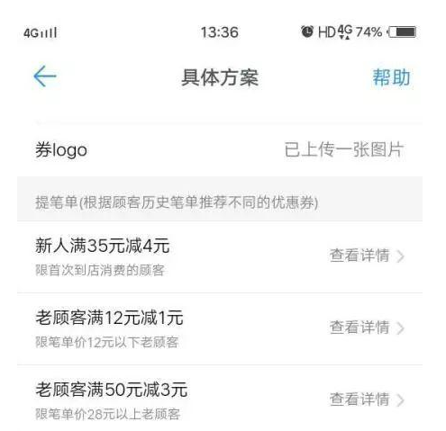 對新顧客,會按照餐廳的人均消費(fèi),以及餐廳的預(yù)算,進(jìn)行滿減,對老顧客則會根據(jù)他的消費(fèi)記錄,給他發(fā)放合適的代金券,不會因?yàn)榇鹑瘽M減的門檻太高,或優(yōu)惠力度太小,而讓代金券成為廢紙、形成營銷誤傷,還能根據(jù)情況給出拉復(fù)購的方案。