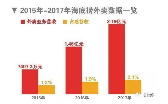公開資料顯示,早在2010年6月,海底撈“Hi撈送”成立,成為首家推出外賣業(yè)務(wù)的火鍋餐廳,至今在國內(nèi)40余個(gè)城市推出外賣業(yè)務(wù),2017年海底撈外賣業(yè)務(wù)收入為2億元。