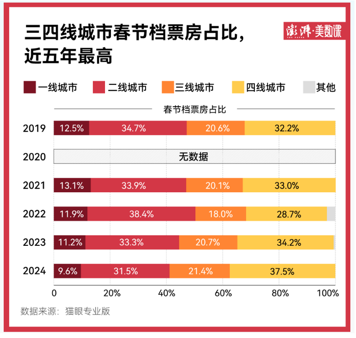 另外,貓眼專業版數據顯示,今年國內春節檔電影市場繼續下沉。2024年春節檔三四線城市票房占比達58.9%,較去年同期提升4個百分點。